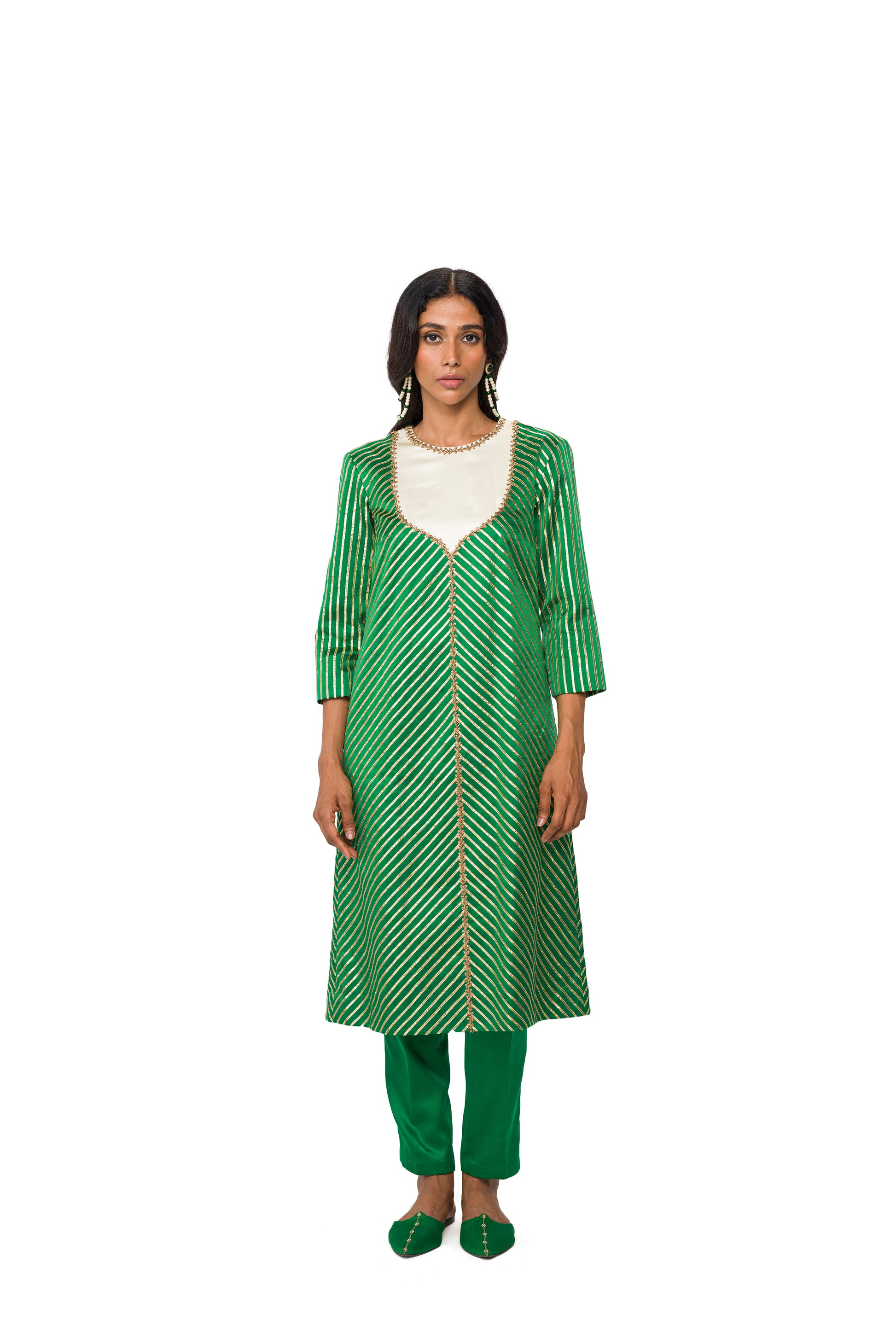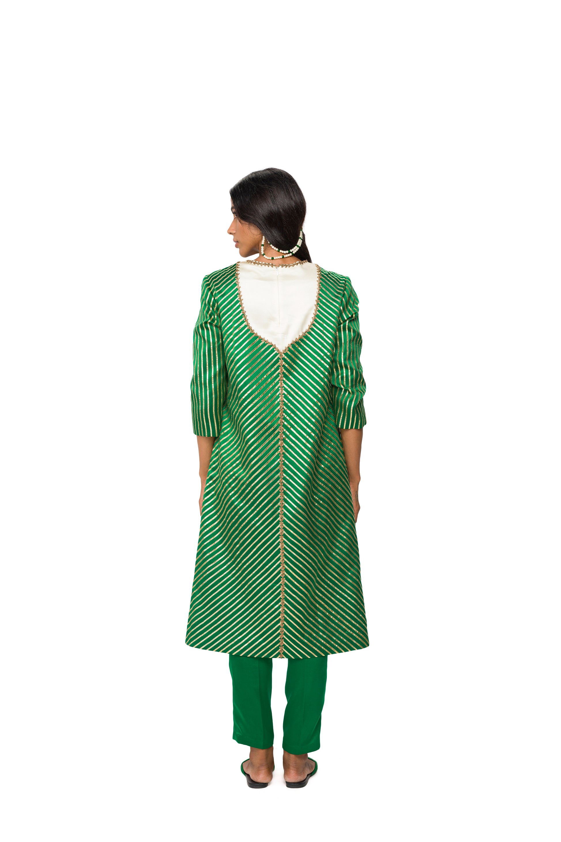 'Tamarai' silk satin kurta features a gota-embroidered jungle green panel appliquéed on natural cream. The neckline echoes the drape of the champakali garlands as seen in Mauryan sculptures, highlighted with zardozi embroidery.