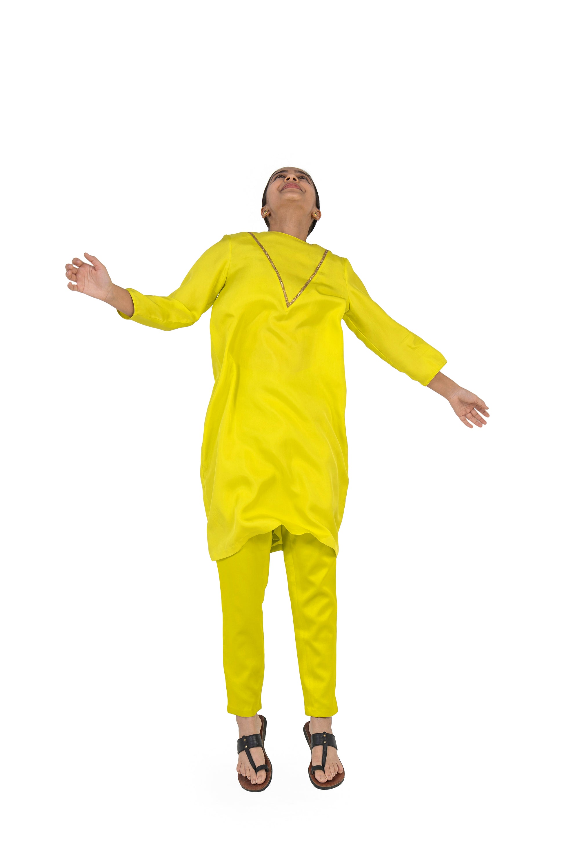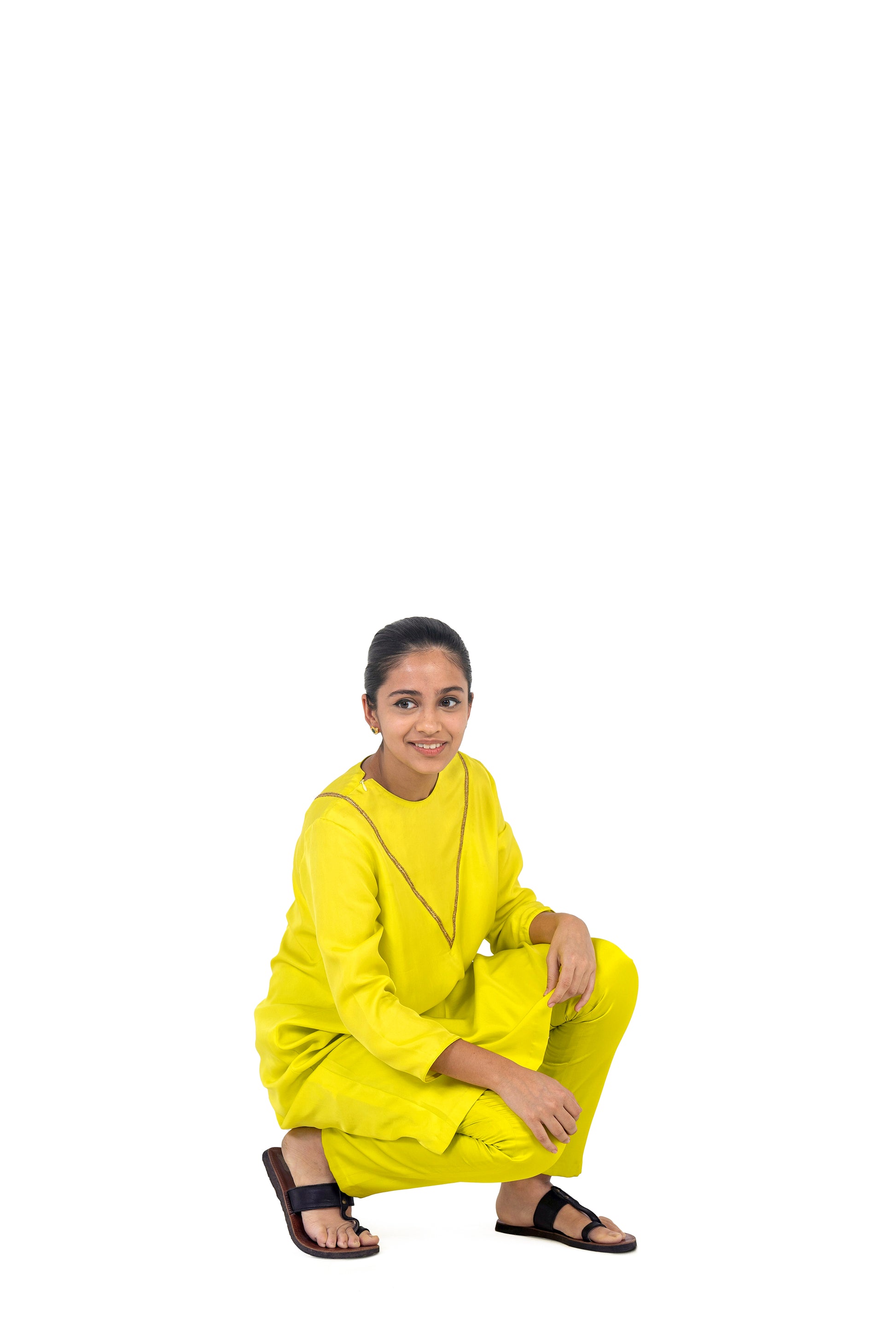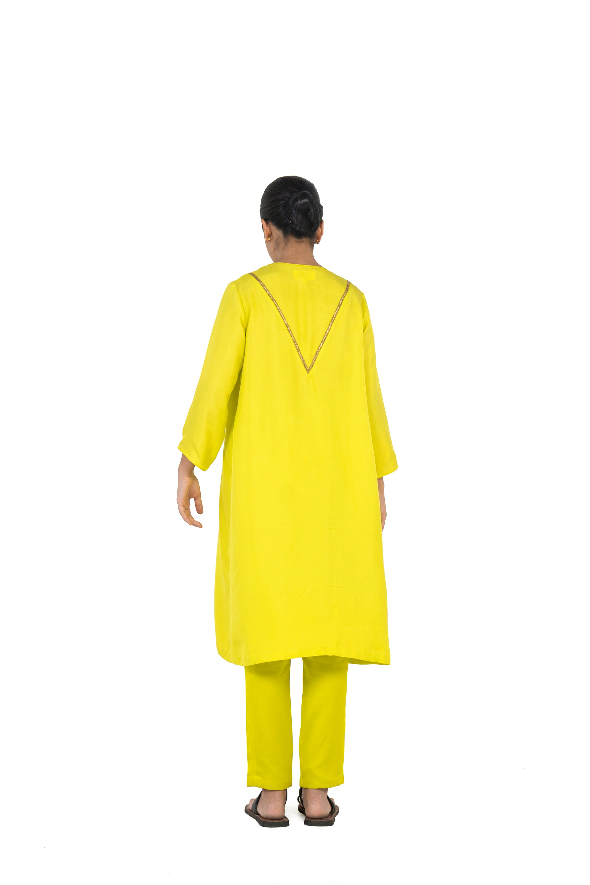 Yellow ‘Taruni’ silk twill kurta features 'gota' details, which involves cut zari ribbons applied onto the textile with the edges sewn down to create patterns as surface ornamentation. It is paired with ‘Varga’ silk twill pant.