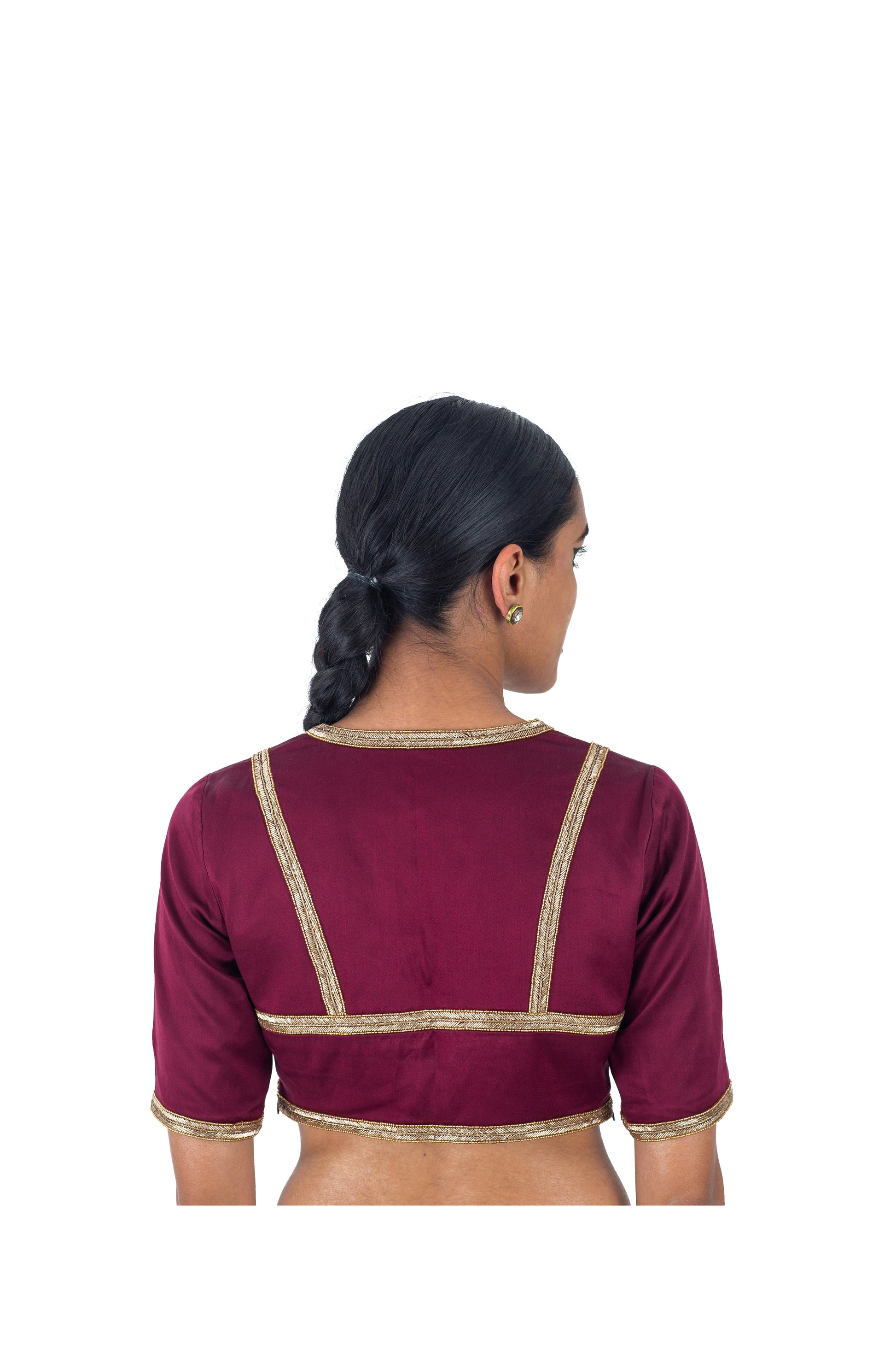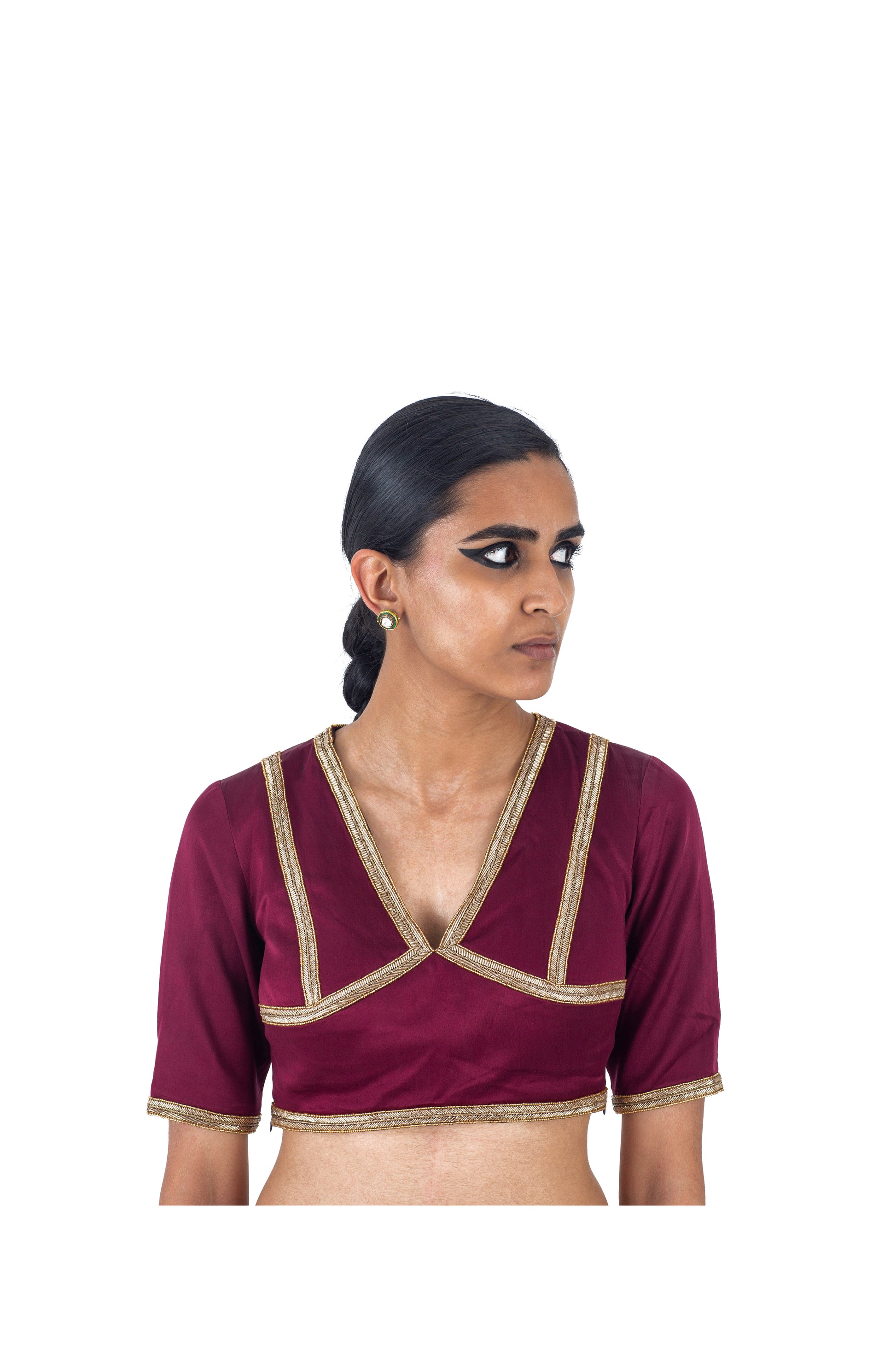 'Trika' maroon satin silk blouse features a v-neck and hand-embroidery highlighting the form.