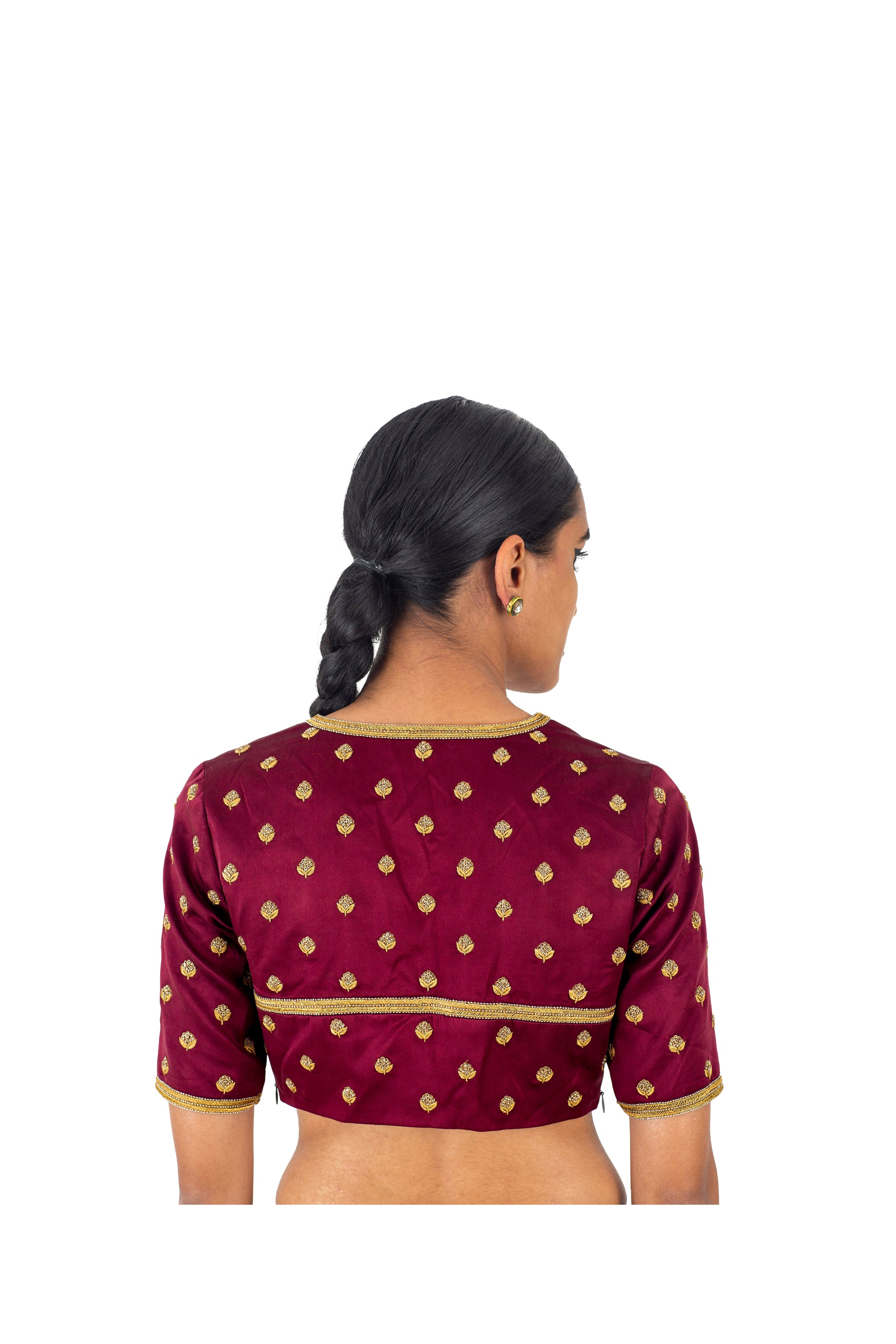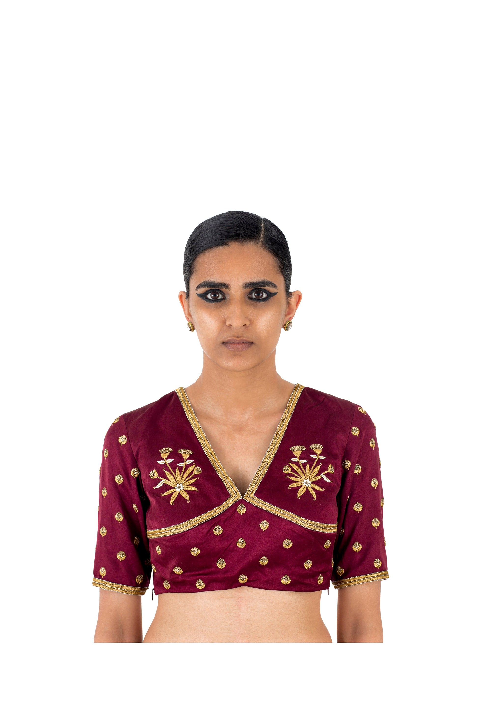 Vimala' maroon satin silk blouse features a v-neck and graphic embroidered floral guldasta on the bust, that draws from the inlay designs in Mughal architecure. The sleeves and body have a constellation of delicate floral butis in 'aari' and Zardozi' embroidery.