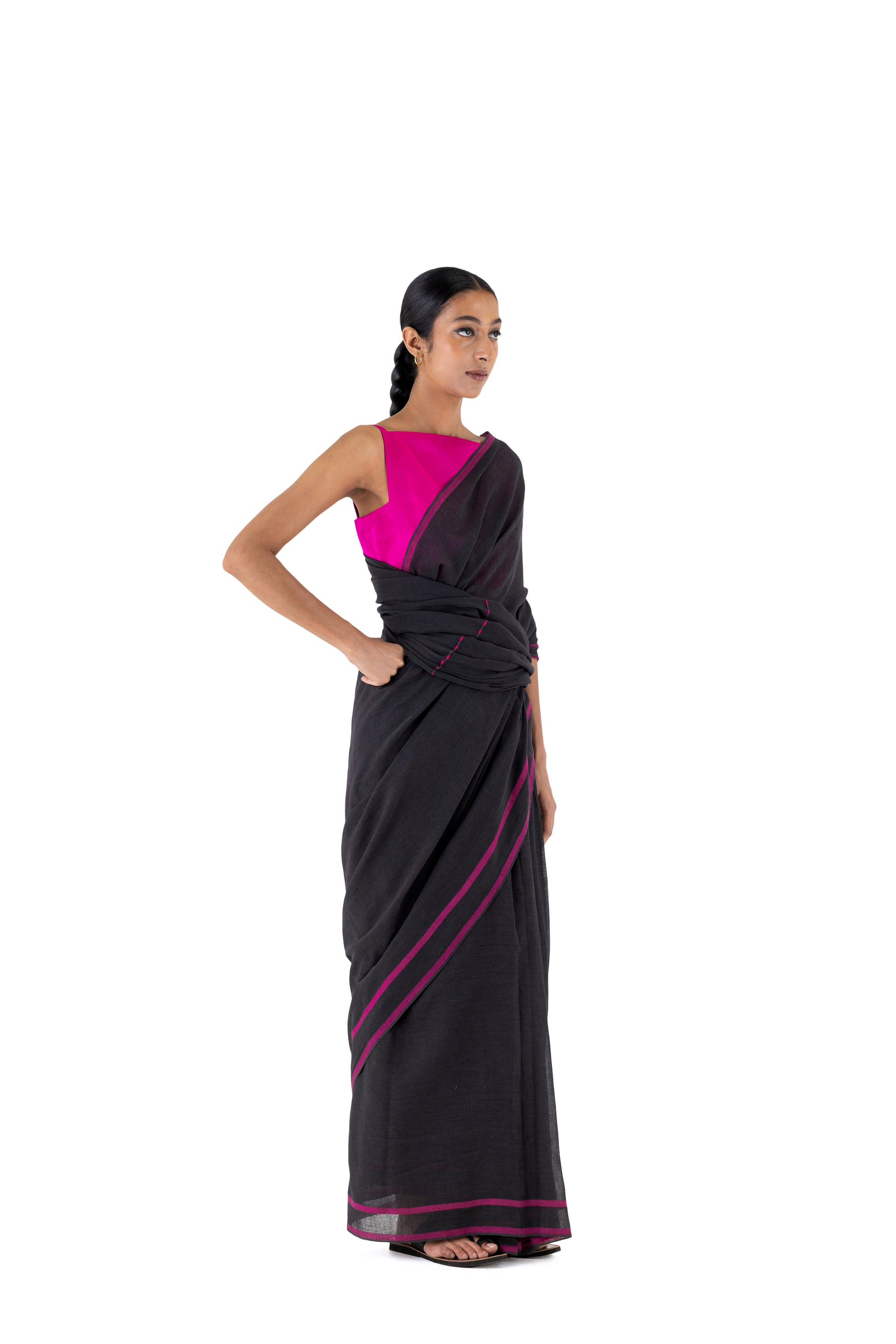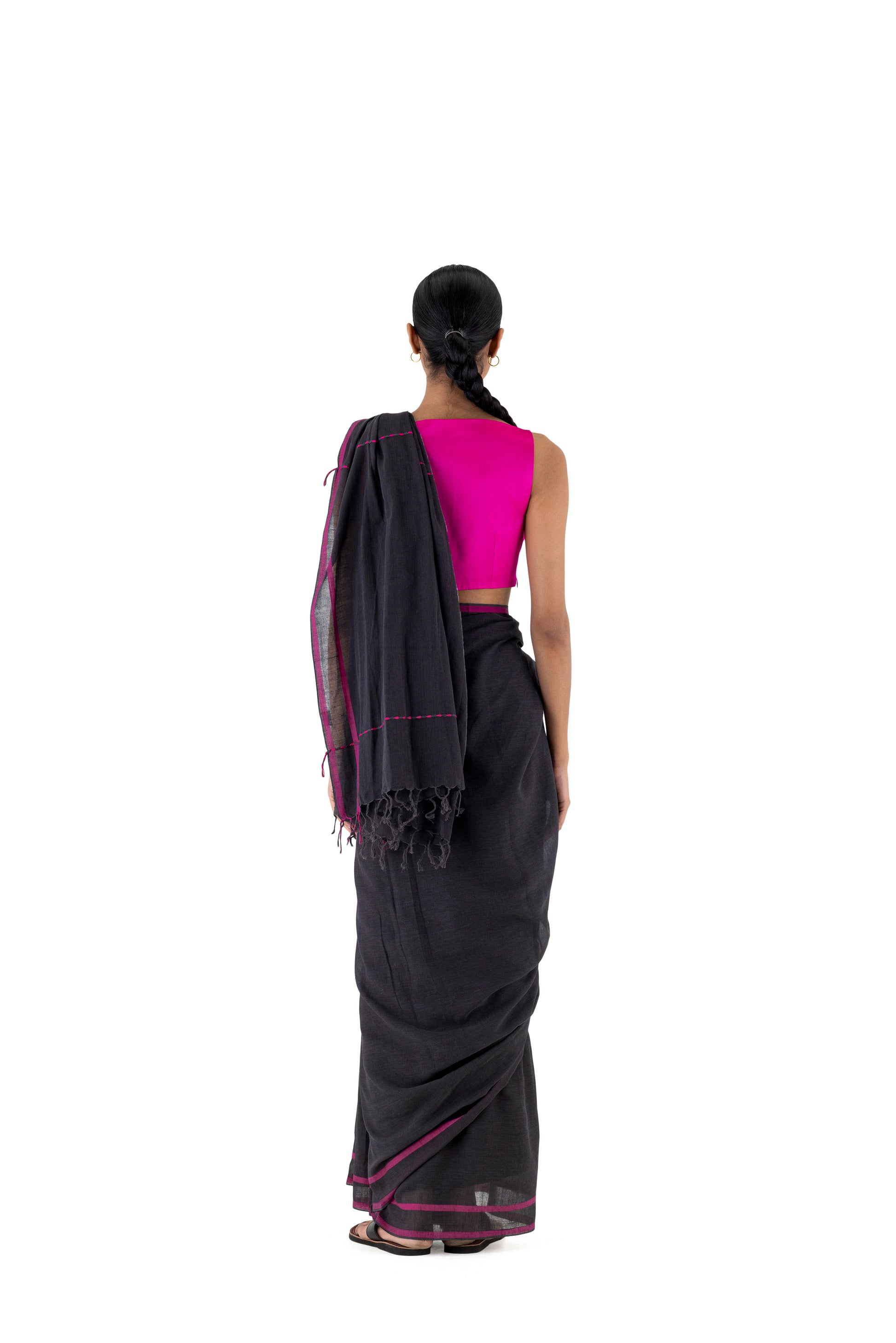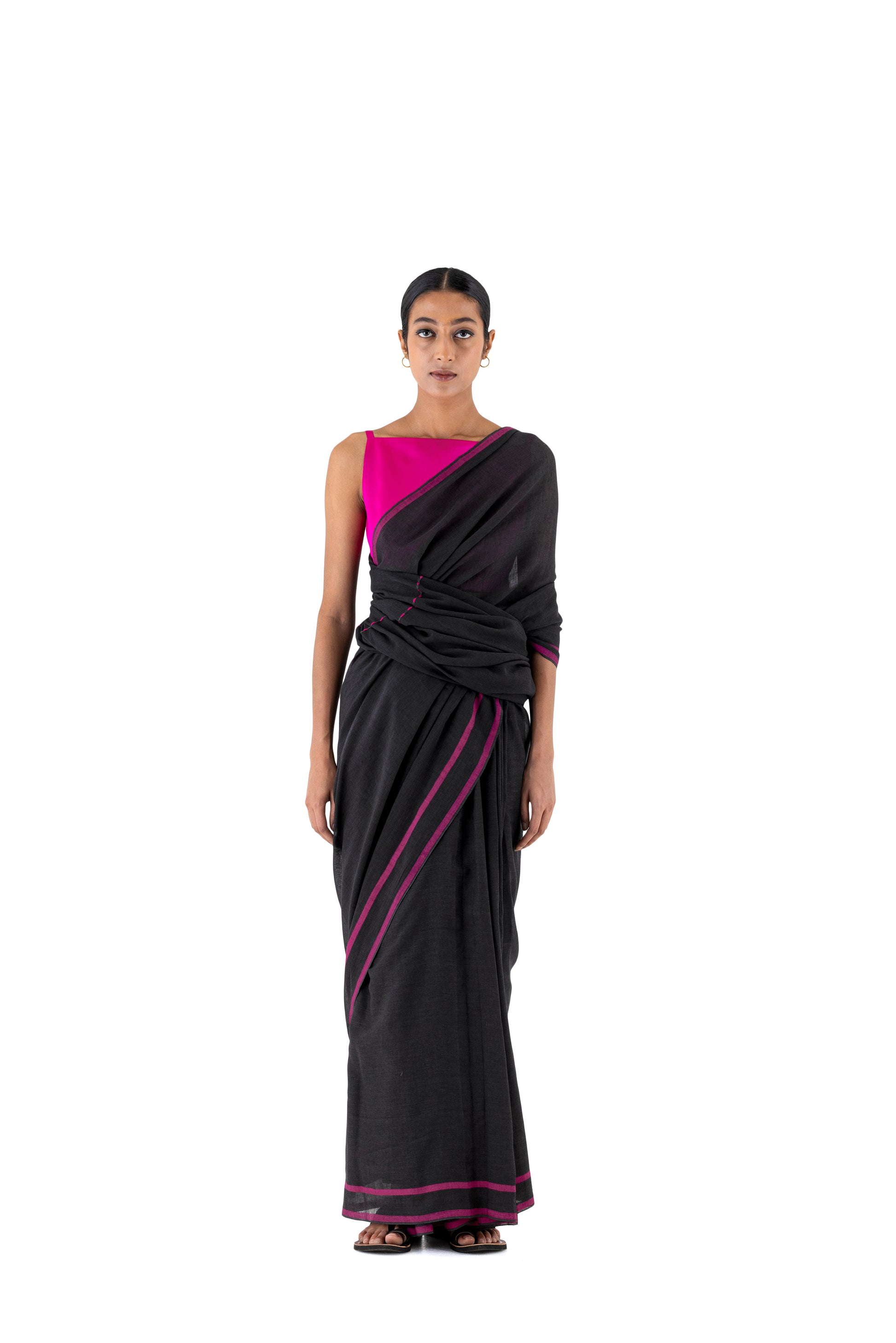 An ideal garment to be worn under the summer sun: 'Yuti' Sooti (cotton) charcol sari features a dual rani striped border.