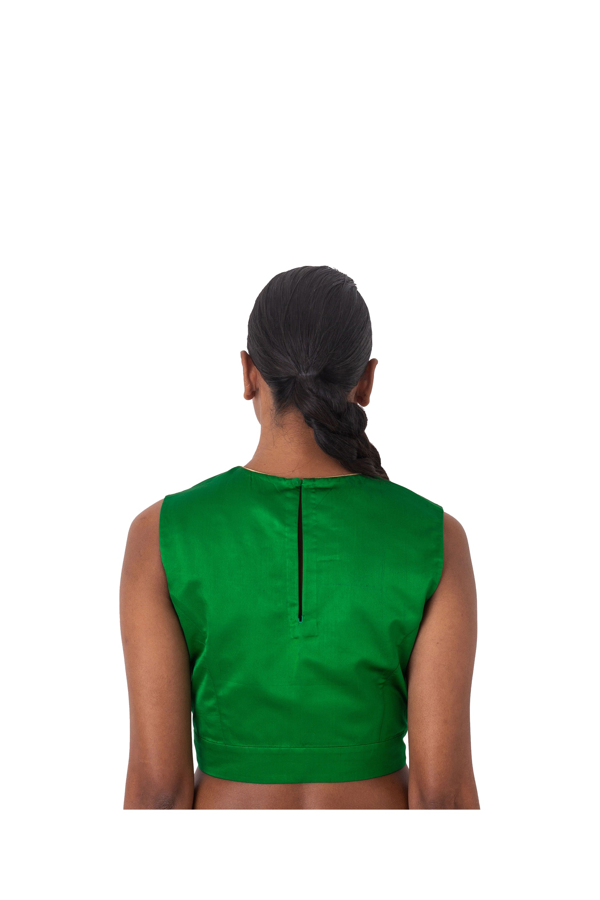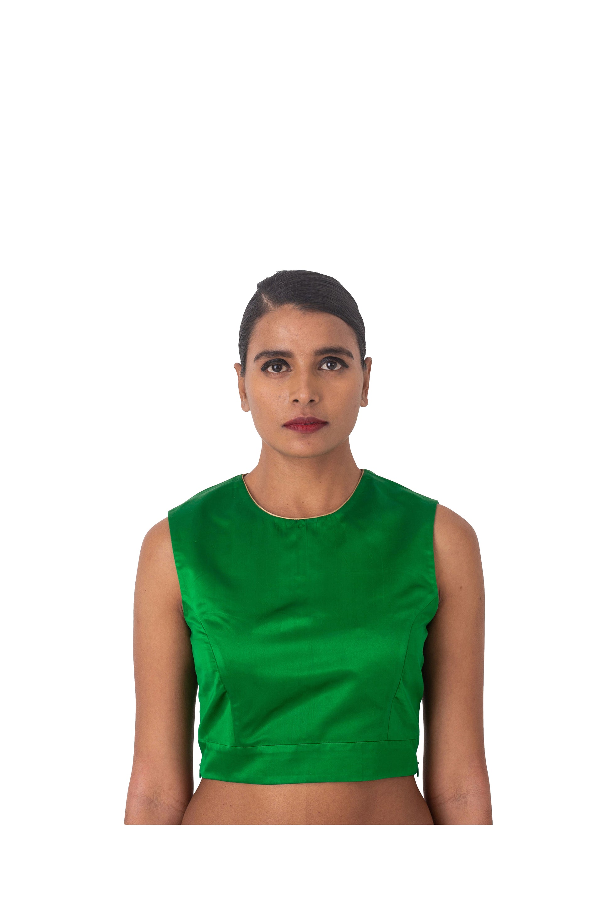 'Zaida' silk satin green round neck, sleeveless blouse is finished with gold tissue silk piping.